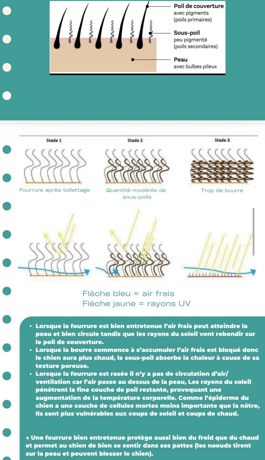 C'est une fourrure composée d'un poil de couverture qui protège la peau des rayons UV ainsi que des piqûres d’insectes et d’un sous-poil (plus proche de la peau) qui emprisonne l’air et sert d’isolant, c’est la partie qui mue.